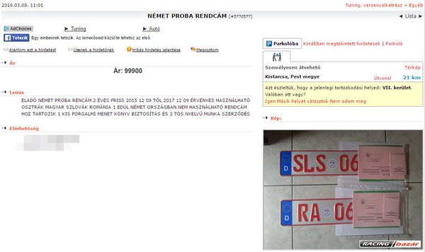 99 900 forint. Ennyibe kerül a teljes autós inkognitó ma, Magyarországon. Nem kell hozzá más, csupán egy pár vadonatúj német próbarendszám, akár azok közül, melyekre egy olvasónk hívta fel a figyelmünket a Racing Bazár nevű apróhirdetési oldalon. Az ilyen külföldi ideiglenes rendszámokkal nehéz megdőlni a magyar rendőr előtt, pedig biztosan hamisak, mármint ha hihetünk az eladónak, aki pontosan ezt állította róluk, amikor megkérdeztem.