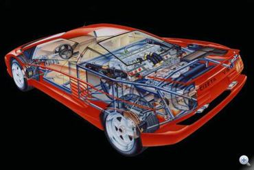 A motor – akár a Jalpából is ismerhetett – két V8-as Lamborghini blokkra épül, a típusjelzés T-betűje az autó keresztmotoros mivoltára utal, de a váltó már hosszában van elhelyezve. Ezen a szinten meglehetősen ritka megoldás, de megcsinálták.