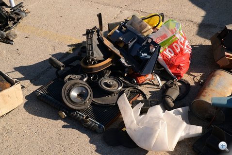 Szétosztottuk a munkát – ez nagyon fontos, főleg, ha közös a projekt - és nekiláttunk. Kipakoltunk három kupac alkatrészt a beltérből: 1. a teljesen típusidegen cuccok (Gloria és Alfa alkatrészek nagy összevisszaságban) 2. kuka 3. a jó lesz még ez nekünk – kupac.