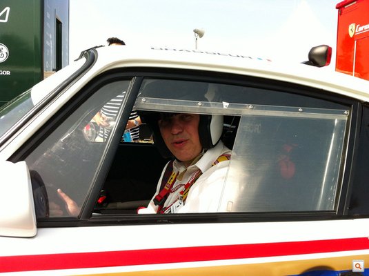Tízpercek zúgtak el anélkül, hogy bármi történt volna. Bukó hamar lett, elkezdtek előszivárogni a Porsche múzeumi karbantartói is, sorra indították a problémás járműveket. Annette és a többi PR-es közben mind lázasan telefonálgatott overallok után. A román kollégának hamar lett egy S-es, ilyenkor jól járnak a kicsik. Az ukránnak is túrtak valami M-eset, ami rám esélytelenül apró lett volna. Végül beindították az én dakaros autómat is, mondták – vezessek végig a tömegen így, ahogy vagyok, álljak be a sorba, ahol a pályára hajtásra várnak az autók. Ott majd biztosan eltelik 5-10 perc, az alatt találnak valamit, majd legfeljebb ott átöltözöm. Ja, a motort ne járassam túl sokáig alapjáraton, mert felforrhat a benzin, és akkor csak sokára lehet újra beindítani. Szuper.