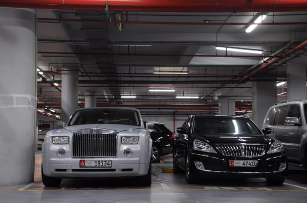 Aznap este, még lementem Dubaj tehetősebb negyedébe, és kíváncsiságból sétáltam egyet az egyik parkolóházban. Itt is lehetett érdekes dolgokat látni, például a Rolls Royce Phantom mellett parkoló Hyundai Equus. Önmagában egyiktől sem koppan az ember álla, de egymás mellett látva érdekes a kontraszt, nézzék csak a Hyundai Spirit of Ecstasy-t idéző emblémáját. Nem sokkal arrébb egy leponyvázott gép állt, a sziluett alapján talán egy Shelby Cobra. A helyi viszonyokat ismerve még akár eredeti is lehet, de mindenképp jobban járt, mint az alig párméterre elhagyott E46-os M3-as. A parkolóházban nincs akkora por, mint kint, de ezen az autón vastag réteg gyűlt össze, nem ma hagyhatták itt.