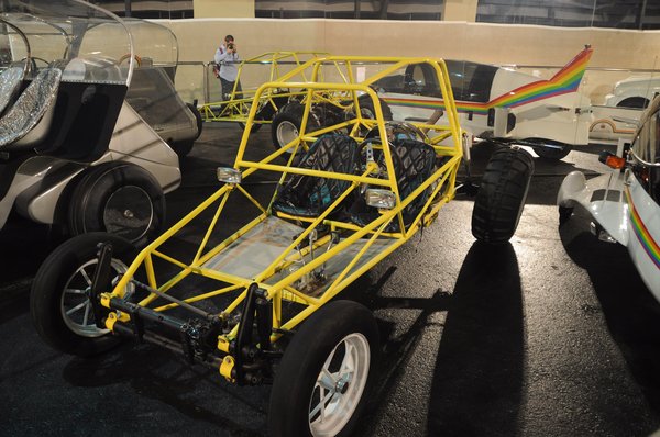 Nem csak a Mercedesekért szakadt meg az ember szíve, a sárga, csővázas, léghűtéses VW technikára épített homokfutó is jobb sorsot érdemel, minthogy a neonlámpák alatt fakuljon. Ez nagyjából a sivatagi csapatós gép minimuma, és egyszerre megértettem, hogy miért lehetett őrületes királyság a hetvenes évek Californiájában fiatalnak lenni. Kapásból mellette az izé, ami szintén VW Bogárból van, ám a tető-gyanánt felhúzott plexi ellenére sem tudok rájönni, hogy pontosan mi volt vele a cél. Egy kicsit valamelyik bóvli sci-fi űrhajójára emlékeztet, amivel a pozitív hős érkezik. Kifele menet még beleütköztem egy elég durva terepre átépített Hiluxba, ránézésre nincs neki akadály ezen a bolygón, bár az állapotából ítélve ez sem sokat mozgott.
