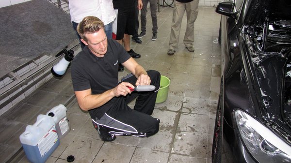 Igen, az igazán gyakorlott, profi szakember simán nekiugrik a falcoknak a nagynyomásúval, csak biztos kéz és jó gép kell hozzá, ideális esetben változtatható nyomású lándzsával. A szilikonos vízlehúzó maga sem újdonság, a használata nem pláne nem okozott meglepetést a közönségnek. Amíg a kocsi a letörölgetés után száradt, a belsejével is elkezdtek foglalkozni. Itt már több olyan fogást használt Christian Resch, ami nem volt mindenkinek ismerős. A Tornador fantázianevű szerkezetet nem mindenhol használják, igazán érdekesen működő cucc. Egyszerre porlasztja a tisztítószert nagy nyomással a koszos kárpitanyagra, rántja ki a a koszt a szövetből és szárít.