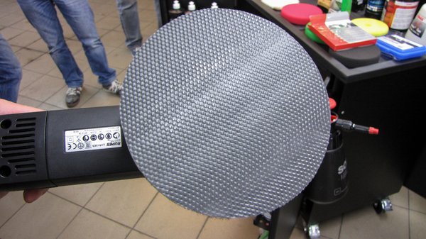 Kiderült, a gyurmának létezik egy klassz alternatívája, igazi lustáknak való cucc, a gyurma-tárcsa. Amit persze nem gyurmával vontak be, hanem valami speciális, nagyon rugalmas, nagyon puha felülettel. Polírozógépre szerelve, a lakkot benedvesítve pikk-pakk végezni lehet a kocsi gyurmázásával.