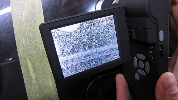 Az alaposan letisztított felületen most már el lehetett kezdeni dolgozni a polírozó szerekkel is. Ilyenkor egy igazán alapos autókozmetikás megméri a kocsi lakkrétegének a vastagságát, mert ha túl sok lemattult lakkot lepolíroz, vagy túl mély karcnak ugrik neki, nagyon gyorsan sok tíz, esetleg százezres kárt okozhat. Éppen ezért nem csak a lakkréteg vastagságát kell figyelni nagyon, de néha érdemes a lakk hőmérsékletét is ellenőrizni. Ugyanis kell a meleg, hogy a lakkréteg teteje szépen kisimuljon, de a túlzásba vitt polírozás miatt még a fémlemezen is gyorsan megéghet a bevonat, hát még egy hőre lágyuló műanyag karosszéria elemen – lásd a korábban emlegetett lökhárító-hűtőrácsot.