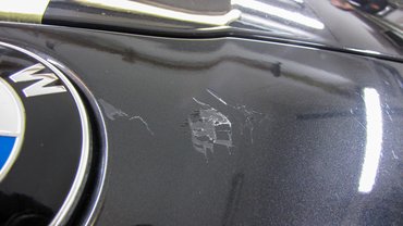 A demonstrációhoz használt BMW a legjobb példa arra, miért is kell az autókozmetikával foglalkozó embereket folyamatosan képezni. Elég megnézni a vesék feletti embléma környékét, hogy lássuk: nem elég, ha van egy jó szerszámunk, azt kezelni is tudni kell. Valakinek sikerült a nagy igyekezetben addig egy helyben csiszatolni a polírgéppel, míg teljesen át nem forrósodott a festékréteg és az alatta levő műanyag. A lakkréteg úgy csusszant le a plasztikról, mint a tejbegríz kihűlt teteje a még forró ételről. Hopp, már ugrott is egy ötvenezres javítás – viszonylag új autó, szóval eleje lebont, komplett elem fényez, eleje vissza, drága móka, na.