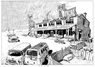 Kezdjük az első kérdéssel. A Totalcarról szól? Nem. A Cafe Postnuclear az elképzelt 1986-os harmadik világháború utáni Magyarországról szól, kitalált szereplőkkel, képzelt eseményekkel, de ismert tárgyakkal, helyekkel, márkákkal és frázisokkal. Afféle magyar Mad Max, ahol a főszereplő piros Symphoniát szív, Orion rádiós pólóban van és kiszuperált Škoda Feliciájával a szegedi 66-os úton hajt.