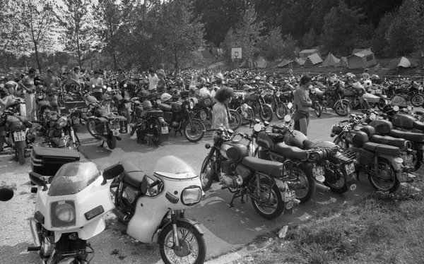 Ez valami nemzetközi találkozó lehetett, látni keletnémet rendszámokat meg más, a szememnek ismeretlen táblákat is. Érdemes csemegézni a tuningolt Emmcetteken : egyiken nagy sportidom, amibe Wartburg-fényszórót integráltak, és az irányjelzők is 353-asról származnak. Mellette, ha jól látom Jawa, rajta üvegszálas műanyagból készült fejidom, kispolszki index, és Škoda visszapillantó teszi teljessé a képet. MZ TS-ek mindenfelé, de egy akkor nálunk botrányosan menőnek számító ETZ-t is ki lehet szúrni (persze, NDK-s rendszámmal), de van pár BMW, és sornégyes japán is a tömegben, sőt Pannóniát is találhatunk. Ki tudja, milyen találkozó volt ez?