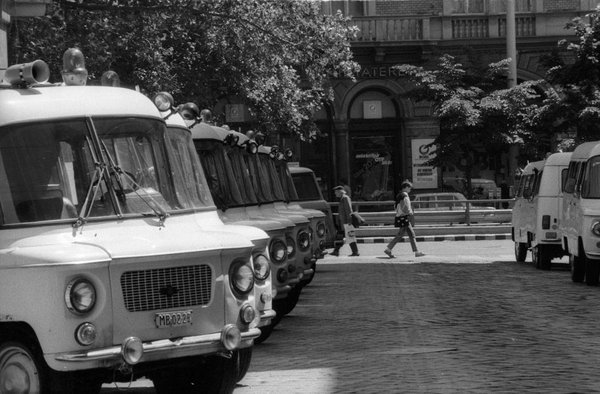 Egyértelműen korszakválasztó év, ezen szerintem senki nem vitatkozna. De ha a részleteket nézzük, van pár apróság, amit vizsgálva nem ilyen egyértelmű, hogy rosszabb lett, mint előtte. Itt van például ez a kép, egy rakás mentőautóval. Ez a látvány nekem mindennap megvolt, erre jártam suliba. És hát ezeket a Nysákat szerintem az égvilágon senki nem sírja vissza, akkora határ fosok voltak. Vizuális környezetszennyezés volt mind, a minőségükről meg beszélni sem érdemes, 1990-ben nagyjából 30 éve elavult konstrukciónak számítottak. Ettől persze, ha ma meglátok egy szép példányt (szerencsére a Mentőmúzeumnak is van), bepárásodik a szemüvegem. Háttérben a Mobil üzlet, ahol Simsonhoz, MZ-hez lehetett alkatrészeket venni, de talán komplett motorokat is.