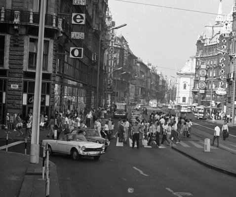 Ez a fotó is gyönyörűen példázza, mi volt nálunk az autós valóság, abban az időben, amikor nyugaton az emberek mondjuk 300-as dízel Mercedeseket vásároltak. Mert itt ugye volt egyrészről az évekig tartó Merkur-várólista, másrészről meg a nagyon más anyagi körülmények. De azért az autóbuzik akkor is autóbuzik voltak, ez is állandó, nem csak a tankönyv-ellátási anomáliák. S ha nem tudsz kényelmes, menő, esetleg sportos autót venni, akkor a meglévő, leharcolt 100-as Škodából alkotsz valami egyedit, olyat, amilyen senkinek nincs. A kilógó S-100 fenék jól mutatja, mi volt akkoriban a tuning-irányzat. Nyomás az autósboltba, hátha épp kapható, amire vágyunk, aztán kis fűrészelés, fúrás-faragás után dupla hátsólámpás, őrülten vagány faros-Skodája lehetett az embernek. Ez ám a fény az éjszakában, messziről láthatta bárki, hogy nem egy akármilyen autó megy elöl. Ráadásul sportos relli-csíkok is kerültek rá, talán épp az akkortájt piacra dobott neolux spray-ből szisszentették a gondosan ápolt dukkóra. Nem csak az autók, de az Október 6. utca is sokat változott azóta , és a tankönyvkiadás is másképp zajlik .
