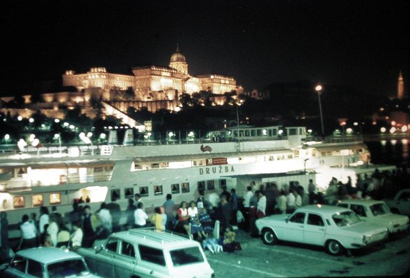 Ezen a képen szinte minden ott van, ami a” működő” szocializmust jellemezte. A Csehszlovák ROH a Forradalmi Szakszervezet üdülőhajója, a „Druzba” horgonyoz a Vigadó térnél. Ezzel a hajóval a jól teljesítő elvtársakat hozták üdülni Budapestre, minden bizonnyal szakszervezeti beutalóra volt szükség az ilyen utazáshoz. A rakparton várakozó turisták mellett pedig ott a szocialista járműgyártás krémje: Volga M24, kombi Warszawa, Trabant, Wartburg, Lada – érdekes módon mind valamilyen világos árnyalatban pompázik. Ó igen, és azok kedvéért, akik nem éltek akkoriban, mindenképpen érdemes elmondani, hiába jött valaki párt- vagy szakszervezeti beutalóval, egészen biztosan nem ugyanazt a kiszolgálást kapta, mint egy nyugati, „kemény valutával” fizető vendég. A szocializmusban a kapitalista turisták voltak ugyanis a királyok.