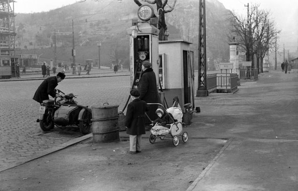 Mivel 56-ban már jártunk, ezt az 55-ös képet választottam, kimondottan motoros témájút, hogy Ivánhoz passzoljon. Csak azt nem tudom megmondani, még ha ízekre is pofoznak, hogy milyen fogatot látunk a képen. Annyi látszik, hogy nem egy ultramodern darab, mármint hogy a paralelogramma villájával és a merev vázzal 1955-ben sem számított annak. Persze az is igaz, mi volt 1955 Magyarországán úgy istenigazából ultramodern. Mert például ez a Szent Gellért téren, A Gellért szálló ellőtt látható, kézzel pumpálós benzinkút sem egy űrrakéta. (Azóta, hogy ezt a részt megírtam, felkerült egy csomó uvaterves fotó a Fortepanra, ott azért vannak nagyon modern épületek, és a faros Ikarus is előremutató konstrukció volt, de azért tudjuk, az ötvenes évek és a hiánygazdaság fogalma kéz a kézben jártak)