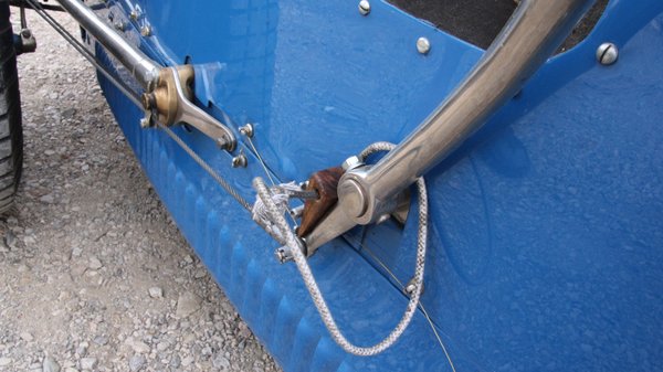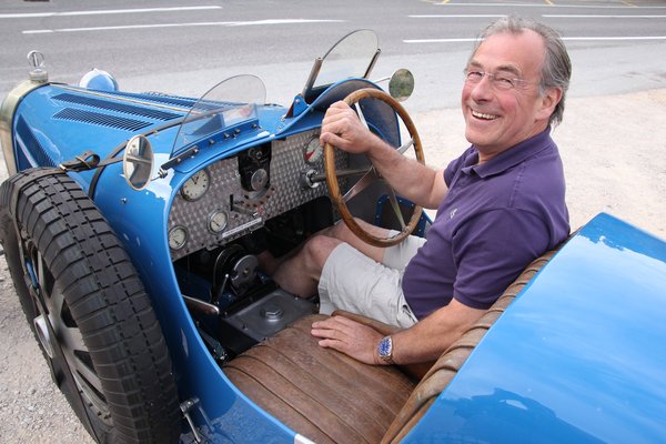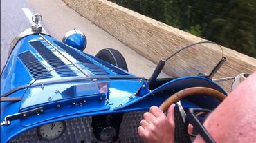 Aztán még az is kiderült, hogy a Bugatti nem túl régóta az övé, igazi versenyautó, valamelyik régi Grand Prix-n is rajthoz álltak ezzel a kocsival, illetve hogy a negyvenes években valahol Svédországban versenyeztek vele – szöges gumikkal, jégversenyeken. És hogy az a kis aranyos, madzagon lógó, láthatóan nem ma faragott kis fa ék mire való: azzal lehet behúzott állapotában rögzíteni a fékkart.