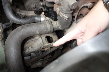 Végül átküldött neten egy képet, hogy megmutassa – igaz, az egy olyan blokkot mutatott, amin még nem volt fent az alsó ékszíjtárcsa vaskos, fokolós tömbje, amitől viszont az én blokkomon alig lehetett észrevenni. De így, hogy láttam miről beszél, már értettem, hol kellene tapogatózni. Meglett a lyuk, átmenetileg beletekertem egy 10-es csavart, ajjaj, szemre nagyon furán állt a pálca. Pedig így való az, csak olyan rég láttam, hogy teljesen kiesett a fejemből.