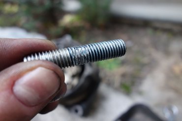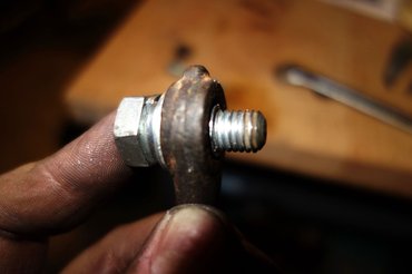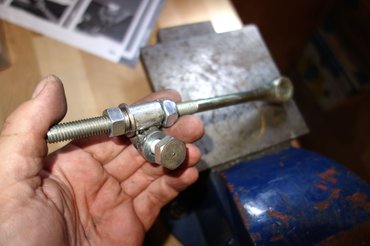 Már csak azt kellett megoldanom, hogy a rúd generátorfül felőli végén (a generátorban ugye, 10-es a lyuk) is jól rajta legyen az állítódió. Aha, csakhogy itt nagyon fontos a méret, a generátoron átmenő csavar ugyanis egyben meg is szorítja az állítócsavart, mert a dió sliccelt. Kevés is ott az anyag, nem akartam 10-esre felfúrni a menetet, szívem szerint mindenképpen az eredeti, 8-as csavarnál maradtam volna. Aki nem érti, nézze meg a képeket, ezt szóban már nehéz elmondani.
