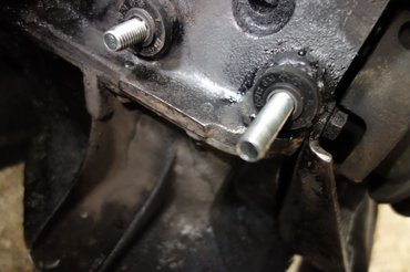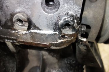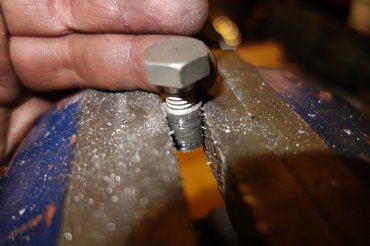 Először azért biztonságból vágtam tőcsavart a generátorállvány belső csavarjához is. Ez egy nyitott lyuk, tehát a tőcsavart be lehet tekerni annyira, hogy beesik a motorba, ezért középen elkalapáltam, hogy a végén ráhajtott anya ne csavarja túlságosan be. Menetrögzítőt is használtam, részben, hogy a csavar biztosan bent maradjon, részben pedig, hogy az olajszivárgásokat elkerüljem.