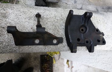 Simon Laci barátom sietett a segítségemre: adott egy vadiúj, rezgős felfogatáshoz való támasztópálcát. Ez voltaképpen egy spéci menetes szár, van benne egy dupla hajlítás, a végén egy illesztett szem, s az egészet alaposan megedzik. Az eredeti felállásban ez támasztja a generátort a felső fülénél, s az ezen levő menettel állítható az ékszíj feszessége is. Pillanatnyi elmezavaromban úgy döntöttem: amíg rá nem találok álmaim régi típusú generátorkonzoljára, addig a meglevő rendszert teszem hibriddé. Megmarad tehát a 123-as-féle állvány, de a felső pontján megtámogatom ezzel a 115-ösbe való rúddal, hogy le ne törjön.