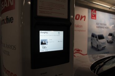 Sajnos a győri CHAdeMO most sem engedte, hogy 84 százalék fölé gyorstöltsük az akkumulátort, a kijelzett 105 kilométeres hatótáv még csak szűken sem lett volna elég az Istenhegyi úti gyorstöltőig, nem hogy egy kis vésztartalékkal. Talán eljuthattunk volna Budaörsig, ahol vagy az Auchan töltőjén vagy a Gablini CHAdeMO-ján rá lehetett volna tölteni, hogy a célig elég legyen a villany. De ennyire szűkre nem lehet tervezni, mérhetetlenül ciki lett volna a Budapest táblánál várni a trélert. Tehát Tatán ismét meg kellett állnunk, és rátölteni az akksira. De ez valahol kötelező kör is volt, meg kellett tudnunk, sikerült-e gatyába rázni egy hét alatt a 11 kilowattos csatlakozót. A golfklub töltője stratégiai ponton, szinte pontosan félúton van az utolsó budapesti és a győri töltők között, másoknak is fontos lehet megtudni, mi a helyzet itt.