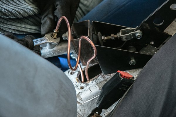 Először is be kell szerelni végre a hidraulikus kéziféket. Régen megvettük már, de a rajta lévő Skoda-munkahenger helyett vásároltunk egy Wilwood-félét, Bandi legyártatta hozzá a csöveket, a fittingeket, leperemezve, helyére egy konzollal felhegesztve hozta készen. Rátolt még a karra is egy nagyjából félméteres csövet, így a helyén beszabhatóvá vált. Nagyon régen terveztük már ezt, hiszen az ilyen gyenge autónál tempóvesztéskor hamar fellép a tapadás, olyankor pedig nincs is jobb, mint egy kicsit ismét elbizonytalanítani, kibillenteni a már-már megtalált egyensúlyi helyzetéből egy gyors kézizéssel. Plusz megindításhoz is jól jön, így kíméljük a kuplungszerkezetet.