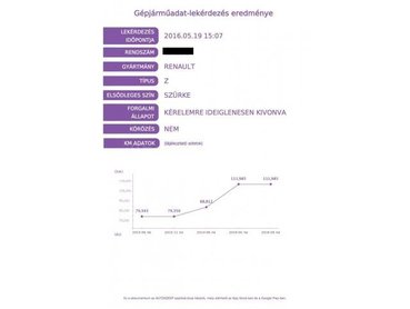 Belekattintunk a fotógalériába, és láss csodát: az egyik kép helyén az Autoszkóp, mobiltelefonos kilométeróra-lekérdező alkalmazásból ismert összesítés ugrik elénk, a korábbi kilométerszámláló-állásokkal és képzeljék a hivatalos adatok szerint sehol nem kezdenek csökkenni a számok. A Mégane-ban, amelyet 110 ezer kilométerrel hirdetnek, három hónapja 111 ezer 985 kilométer volt. A csekély eltérés és a puszta tény, hogy már biztosan akad legalább egy kereskedő Magyarországon, aki lekérdezi az általa kínált autók korábbi óraállásait, lázas telefonálásra ösztönzött.