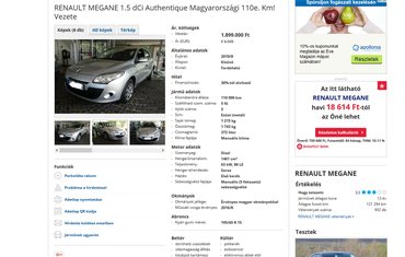 Egy másik Mégane és egy Ford Focus kombi hirdetéséhez is mellékelték a lekérdezés eredményét. Ez, ha nem is tökéletes bizonyosság a vevő számára, mindenképpen jó támpont, de ma még szinte ismeretlen gesztus a magyar piacon. A lekérdezés eredményének közlése követendő példa a többieknek, mert ha sok magáneladó és kereskedő rászokna, végül nehéz helyzetbe kerülnének a csalók, igaz, csak az évek óta magyar forgalomban lévő kocsik esetében. Éppen itt volna az ideje.