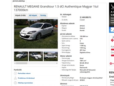 Olvasónk, aki valószínűleg Renault Mégane vásárlását tervezi, véletlenül találta meg egy budapesti kereskedés ajánlatát, amelyben eddig nem látott módon tájékoztatják a vevőjelölteket. A zuglói Auto-motor Centrum Használtautó.hu-s hirdetésében egy 2010-es évjáratú Renault Mégane Grandtour szerepel, a tipikus 1,5 dCi turbódízel motorral.