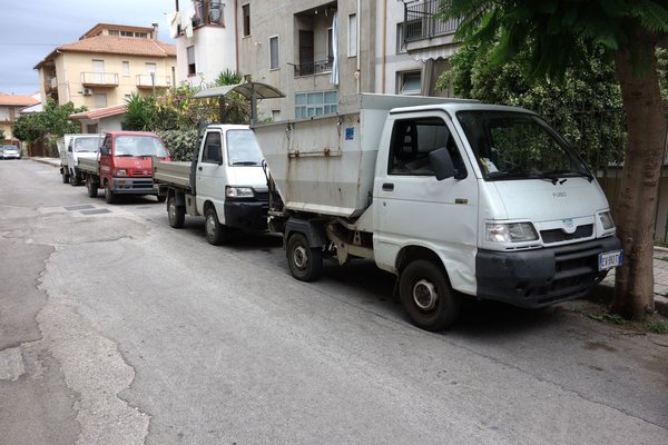 Piaggio Apék a hatvanas évektől a legújabbakig vasvillán hányható mennyiségben vannak jelen, fel is tartják a forgalmat rendesen. De a teherautókínálat csúcsa nekem még az Iveco előtti korszakból származó, nagy, szivattyús Fiat-teherautó volt. Hogy ezek mennyire jól néztek ki, azzal a hatalmas, paralelogrammás emblémával az orrukon... Azt ugye tudják, hogy egy nagyjából minimum negyvenéves teherkocsi ez, napi szolgálatban? A hely Trapani, épp egy strand ciszternáját ürítik vele. Vagy valami hasonló.