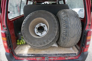 Illetve egy kicsit több, mert egyszer egy földúton leszakadt a sebmérőspirál és valami potom 20 ezer kimaradt. Ja, igen, ennek a kilométerszámnak tíz-húsz százalékát földúton tette meg a kisbusz, hiszen nehézgépekhez szállít alkatrészt, embert, szerszámot, de ugyanolyan egykedvűen viszi a terményt vagy bármi mást. Most is éppen bent volt két szerelt kerék a jó Isten tudja, mihez.