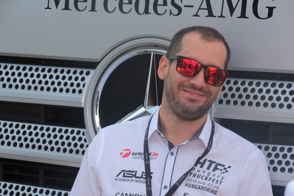 A DTM paddockjában mászkálva hol máshol találkozhatna ez ember Kiss Norbival Európa-bajnok kamionversenyzőnkkel, mint egy Mercedes-Benz nyergesvontatónak támaszkodva.