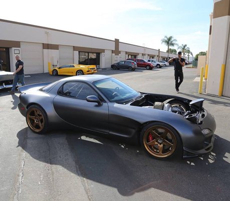 És itt jött az isteni szikra: Rob úgy döntött, hogy megépíti a végső Wankel-sportkocsit, természetesen egy RX-7 alapjara, hiszen suszter maradjon a kaptafánál. Nem lehet sokat tudni a félkész gépről, azon túl, hogy most épp a SEMA Shown - tunerek és alkatrészgyártók éves szakmai kiállítása - pózol. Annyi mindenesetre látszik, hogy négyrotoros lesz a motor, egy gyári 20B, amit az Eunos Cosmo luxuskupéba szerelt a Mazda 1990 és 1996 között. Két liter Wankel-mércével már elég nagy lökettérfogat, de biztonsági alapon rácsavaroztak még egy akkora Garret turbót is, amiben óvatlan pillanatokban komplett út menti marhacsordák tűnhetnek el.