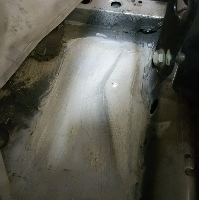 Jobb utastéri padló kilakatolva, két hátsó zseb kilakatolva, hátfal kilakatolva, hátsó kötény kilakatolva, négy szilent cserélve, kerékőrök kivéve, szigetelés berakva, Csaba még szigetelte, le is fújkálta a cuccokat emitt alvázvédővel, amott kikevertetett festékkel, bár szabadkozott, hogy ehhez tényleg nem ért. Nem is lett szép, de a célnak megfelel, tényleg nem is akartam jobbat most. Még arra is talált időt, hogy a beáramló nedvesség miatt erősen korrodált hátsó lámpatest-érintkezőket rendbe tegye. Ezek után csak a 30 ezres anyagárat akarta elfogadni...