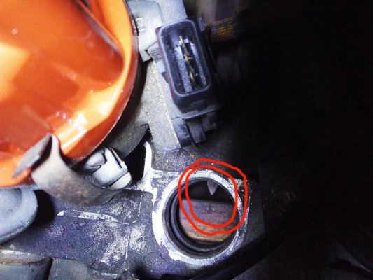 Csakhogy az az olajszivattyú...Annak ugyanis helyzete van, annak a túlfele hajtja ugyanis a gyújtást. Én meg csak úgy hopp!, kihúztam. Majd elforgattam a főtengelyt. Minden hibát elkövettem, amit lehet. Sebaj, orvosolható a dolog. A főtengelyt felső holtpontra kell igazítani, ilyenkor be kell nézni a gyújtáselosztó kivétele után maradó lyukba, ott az aszimmetrikus sliccel kialakított hajtásnak a kocsi felé kell aszimmetrikusnak lennie és 22 fokon kell állnia, ami azt jelenti, hogy történetesen épp egy jellegzetes öntvény-sarok felé mutat. Mi sem egyszerűbb.