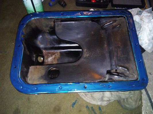 Ez annyira nem egyszerű, mert az olajteknőben van egy hullámzásgátló lemez, amiatt meg mindenféle trükkös forgatásokkal lehet csak felhelyezni pozícióban (nem sokat tett hozzá a buli hangulatához a teknő szélén szépen elkent, majd lassanként a leömlőkön, a kezemen, a futóművön és a keresztstabin megjelenő Teroson-kenőcs). Az sem öröm ilyenkor, hogy az olajteknőt az olasz (vagy éppenséggel Hruska) 345 692 129 csavarral gondolta rögzíteni a blokkhoz,egyik se talál a helyére, mind ragad a kék trutyitól stb.