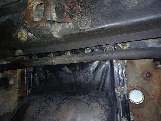 A teknő kocsi eleje felé eső csavarok pedig pont a keresztstabi pálcája fölött vannak, kulcs nem fér hozzájuk, de én azért kitaláltam, hogyan kell: a kis crova 10-es fejébe tettem egy anyát, majd a kiszemelt csavart, hogy az jól kilógjon a dugóból, majd a keresztstabi mögé oldalról ferdén befűzve végigvittem a lyukra, s ott egy ügyes billentéssel betekertem. Kellett vele tökölni, de sziszifuszi munkával végül mindet meghúztam.