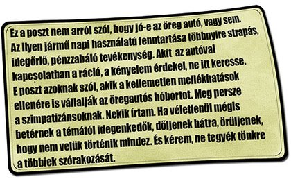 Bezzeg az ésszel, szép, eladó autóként megvett, pokoli pénztemető 124-es Merci, a Hans! Vagy az állandó szerelést kívánó, mindig morgó, de egy kedves családtól megvett Era, a 123-as kombi. Vagy a korábban a rózsadombi, vagyonokért hozzám került, hamvasan új állólámpás, a Kardos úr, ahogy hívtam, amiről menet közben kiderült, hogy kétszer annyit futott, lerogyasztották a hátulját, és lehet, hogy Bécsben szereltették valamikor, de előttem már legalább ötször valami Rigákon edződött sufnibetyár berhelte.