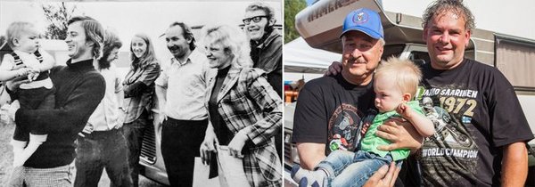 Képalá: A depóban feltűnt egy göndör hajú holland, aprócska fiúval a babakocsiban. A holland neve Jarno, Saarinen után, a régi fotón pedig épp ő csücsül Jarno Saarinen karjaiban, akivel szülei baráti viszonyban voltak. A másikon pedig a holland Jarno látható, akinek gyermekét a néhai Jarno testvére, Jari tartja a karjaiban. Azt hiszem talán ez volt a hétvége legmegkapóbb pillanata, Kallio vasúti sínes ugrását leszámítva.