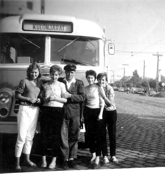 A másodikos országjárás során Debrecenben készült a fotó az Ikarus 31-esről és néhány résztvevőről. A buszokat a Volán egri telepéről béreltük, a képen is szereplő Józsi bácsi volt a sofőrünk ebben az évben, aki jól viselte a harsogó éneklésünket végig az ötnapos úton, vidám, kedves, kellemes ember volt. Talán ezért is került a kép középpontjába. Az ő további sorsát nem ismerem, több mint fél évszázad alatt sok dolog megesik. Sajnos, közülünk is elmentek néhányan, így a képen szereplő két Mária is.