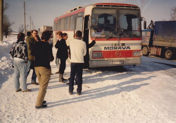 1988 decemberében járunk, így a fotó még pont belefér a kiírásba. Apám munkahelye (Pécsi Bőrgyár) buszos utat szervezett Isztambulba. A buszuk persze már az odaúton elfosta magát. A képen az látható, ahogy a kollégák (apám háttal, fehér pulcsiban) semmittevéssel próbálják elütni az időt valahol az isten háta mögött Bulgáriában.