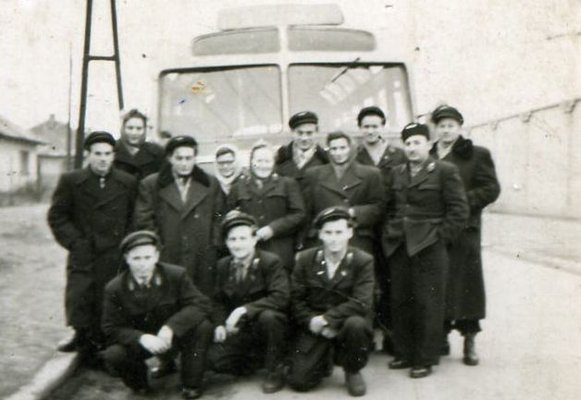 (Szerszámgépgyár, Győri Textil, Gázgyár) Sofőrök (bal szélen apám) és kalauzok várják a visszaindulás idejét. [link]
