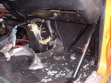 A facebookos kommentek alapján az autó közel 2000 lóerős, a képeken is látszó tisztességes kompresszor fújja, és alkoholt éget el, tehát vélhetően versenyeznek vele. Ennek fényében különös, hogy nincs a váltóharang körül egy páncél, amely előírás, ha valaki NHRA futamokon akar rajthoz állni. A másik megoldás a transmission blanket, ez egy olyan kevlár takaró, amelyet a váltóházra hevedereznek fel, megelőzendő a képen látható baleseteket. Nagyjából 100 dollártól lehet megvenni egy ilyet, de még a drágább darabok is kevesebbe kerülnek, mint egy bokát visszavarratni. És, hogy milyen érzés belülről, amikor robban a lendkerék? Ilyen: