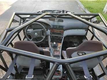 A motor érintetlen maradt a direktszűrőtől eltekintve, ahogy a hatgangos váltót sem cserélték ki. A diffit viszont lehegesztették, ami sokat elárul a várható felhasználásról, ugyanakkor kérdések is felmerülnek: az autó hátuljában kevesebb súly van, mint valaha, viszont az első tengelyt húzza egy nagy, nehéz nyolchengeres motor. A fixre zárt hátsó tengellyel és a 290 lóerővel valószínűleg több mint szórakoztató vele a csapatás. És ami a legdurvább, hogy a gokart 5-ös BMW ebben a formában rendszámot kapott, igaz, ez Knytych érdeme, aki fényszórókat és indexet épített a kocsiba. Ezzel persze egy pillanatig sem szeretném azt mondani, hogy gyárilag ne lett volna benne.