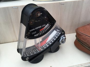 Sok érdekes, sosem látott, régi autós kiegészítőt lehet találni a nagy forgatagban. A fura, tapadókorongos műszer képét többeknek is mutattam, de nem sikerült megfejteniük, mire is való – fotóról talán én sem mondtam volna meg. De úgy, hogy a kezemben tarthattam, és láttam, hogyan reagál a mozgatásra, hamar leesett a tantusz. Ez kérem egy lassulásmérő, ezzel lehetett letesztelni, hogy a járművünk fékje megfelelően működik-e. A nagy mutató a lassításkor előrelendül, viszi magával a szorosan járó pici tűt, és ahol a pici tű megáll, ott leolvasható a legnagyobb lassuláshoz tartozó érték. Egy pofonegyszerű, mechanikus szerkezet, még a fékpadok elterjedése előtti időkből.
