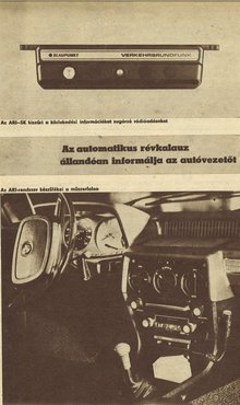 Ha az NSZK-beli Blaupunkt gépkocsi-irányító rendszere beválik, az autósok a jövőben mind a vidéki, mind a városi utakon térkép nélkül is jól eligazodhatnak. Mindössze négy billentyűt kell lenyomniuk indulás előtt megadva a berendezésnek úti cél kódját, ezt követően minden információt automatikusan megkapnak. A vezető képernyőről kap tájékoztatást a követendő útvonalról, a pillanatnyi közlekedési viszonyokról, a mindenkori érvényes sebesség-előírásokról, stb. (...)