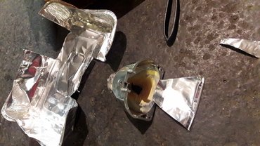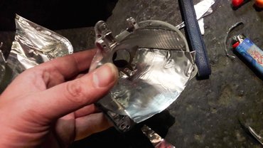 Kihívásként tekintettem a feladatra, ez egy nulla forintból megoldandó projekt kell, hogy legyen. Festés szóba sem jöhetett, mert jelentős mennyiségű anyag hiányzott a reflektorból. Addig túrtam a tárolóban, amíg rám mosolygott a szerencse egy alumínium grilltálca képében. Príma anyag, nehezen rongyolódik. Fémlemezzel fogom pótolni az elolvadt részt, fényes és hőálló. Nagyjából méretre vágtam egy szeletet belőle. Hőálló ragasztóval lett volna tökéletes a rögzítés, de este kilenc után már nem indultam el teszkózni.