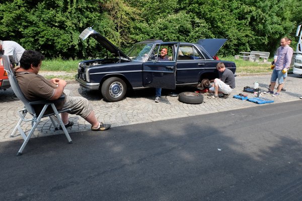 A kék Merci volt az. Igen, az az állólámpás, amely ugyanúgy a tavaszi, ornbaui klubos túra előtt készült el alig pár perccel, mint a Pontonom. Ez konkrétan az az autó, aminek kapcsán megismertem Zsoltit, amikor a kocsi bemutatkozó útján elhozta azt a Bánki-tóhoz, az akkori Belsőség-talira. Onnan hazafelé le is rohadt vele éjjel a 2-es úton, pici kislánnyal, feleséggel, ahogy kell, aztán a családja valahogy hazakerült, de ők még a szerelőjével, Zolival hajnalig kínlódtak, hogy végül tréleren jusson haza az átok.