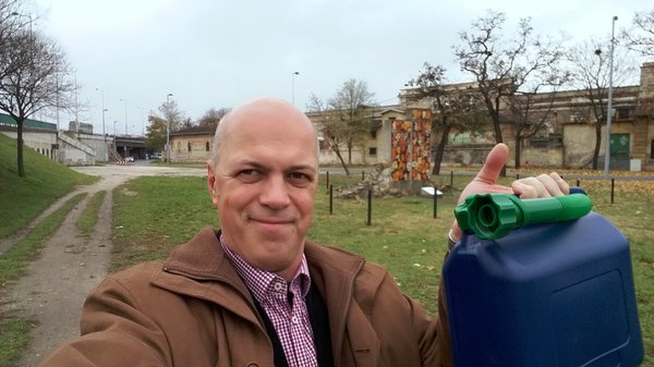 Én a két óra alatt folyamatosan azon gondolkoztam – vajon a benzinmérő kontaktos annyira, hogy amit én fél tanknak hittem, az üres? Láttam már ilyen állólámpást. Előadás után, kissé szerényen öltözve a cudar időjáráshoz, elgyalogoltam a szemre közel eső, lábilag már kellemetlenül távoli OMV-kúthoz, vettem kannát, bele benzint, vissza, családot összeszedtem az előtérben, zakó hajtókája alatt benzint csempésztem a mínusz harmadikra.