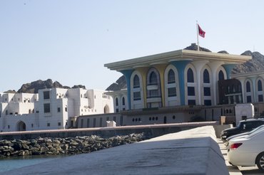 A kép nem mellesleg az Al Alem (A zászló) palota szomszédságában készült, a jelenleg uralkodó Kabúsz szultán egyik rezidenciája. A kép nem adja vissza, de hatalmas épület, az ernyőszerűen túllógó tető elképesztően néz ki. Nem mehettünk be, hiszen egyikünk sem a holland királynő, legutóbb őt látták itt vendégül, még 2012-ben. Jelenlegi formáját 1972-ben kapta meg, de több mint 200 éve épült.