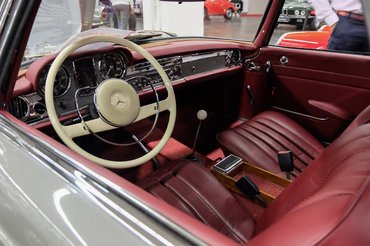 A bácsi – akit én olyan 65 évesnek tippeltem, aztán kiderült róla, hogy 77 – maga újította fel a kocsit négy év alatt. Szép az autó, sötétszürke, piros bőrbelsővel, nem annyira prospektusszerű, mint a Ponton, de mindenképpen gyönyörű és láthatóan hibamentes példány. Kicsit túl modern a gumik profilja, kicsit magasan áll a segge (egy központi rugó kérdése az egész), de nekem például nagyon kéne. Ja, és mivel korai, 1964-es változat (csak két évvel idősebb a Pontonomnál), ezért még az a négy helyen csapágyazott, M180-as, kettőhármas sorhatos motor van benne, mint az én otthoni állólámpásomban, igaz, ez befecskendezős. Külön piros pont.