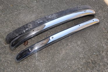 Baj lesz a lökhárítókkal is, az IGAZI Steyr-Puchok legjellegzetesebb elemeivel is. Ezek ugyanis a Fiat 500 szögletes profilú elemeivel szemben kis híján félkör keresztmetszetűek. Van ugyan három lökösöm, de mind a három férges. A legszebb, a csillogó, krómos felületű randa lukakat hordoz random helyeken – talán rendszám- vagy ködlámparögzítésre szolgáltak. A szintén krómos, de ragyás felületűt olyan sokszor újították már fel, hogy Everling Rudi bácsi, a szaktekintély azt mondta – már egyszer sem lehet átcsiszolni a krómozás előkészítéséhez, mert elmállik.