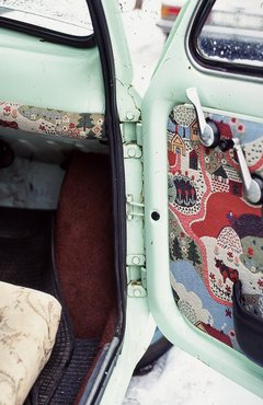 Az autó belseje amúgy sem volt valami szép, a házilag, furnérlemezből és szivacsból készített ülésekre húzott, brokátos-virágmintás, szürke-rózsaszín kanapéhuzatával, a magas támláival, amelyek miatt nem lehetett bejutni a hátsó ülésekre, a hasonló brokátos szövettel áthúzott térdvédőivel a műszerfalon (azok egyébként eredetileg feketék). Ezért ősszel, amikor Imolába mentünk börzézni, mellesleg bontózni is, a Fiatokat is megnéztünk. Forliban, az egyik bontóban vagy 8-10 Fiat is volt, kettesével, hármasával egymás tetején. Zsolt felmászott rájuk és benézett mindegyikbe. Az egyikben, ami két autó között, a gúla közepén a szendvicshúst jelentette, az üléshuzatok alatt egy hibátlan, sötétbordó L-es belsőt talált – L az 500-as luxuskivitele volt, amelyben dönthetők az ülések, az ajtókon van térképzseb, a szőnyegezés pedig nem öt darabból álló gumikészlet, hanem egy egybesütött, alulról gumírozott, felül viszont kellemes szövet teknő. Az ajtókat nem lehetett kinyitni, az apró lyukon át mászott be az autóba, majd az ablakon át préselte ki az üléseket, szőnyeget, ajtókárpitot, mindent. A műszerfalon talált egy Szent Kristóf-mágnest, ami az utazók védőszentje, így azt is elhozta. Már nem emlékszem, mennyibe került, de igazán nem volt drága a garnitúra. A kisteherautóba, amivel mentünk, simán befért, ahogy később a börzén megvett kismotor is.